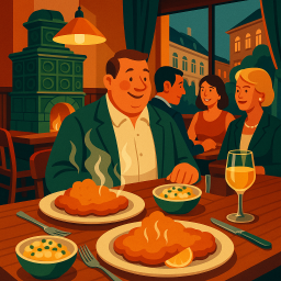 * Peter can now enjoy the dinner with his friends at Gasthaus Rebhuhn Wien!