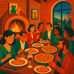 * Peter can now enjoy the dinner with his friends at Il Gatto che Ride Solarolo!