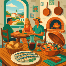 A very traditional evening serving a set menu of 7 dishes - 5 starters & 2 main predominantly fish with just one Pork dish. Free flowing delicious wine all for €38 per person. Food absolutely delicious & service attentive - only snag is c