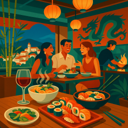 * Peter can now enjoy the dinner with his friends at Restaurant Asiàtic HongHu Muro del Alcoy!